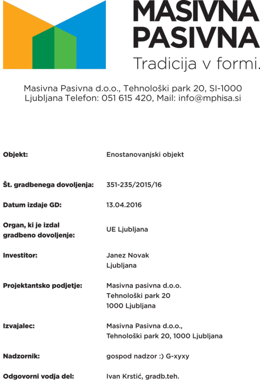 • PZI – projekt za izvedbo, ki vključuje: vodilna mapa, načrt arhitekture (tehnično poročilo, prikazi, detajli, popis del), načrt gradbenih konstrukcij (statični izračun in armaturni načrt), načrt strojnih inštalacij, načrt elektro inštalacij, načrt pametnih inštalacij, Izračun PHPP za optimizacijo elementov